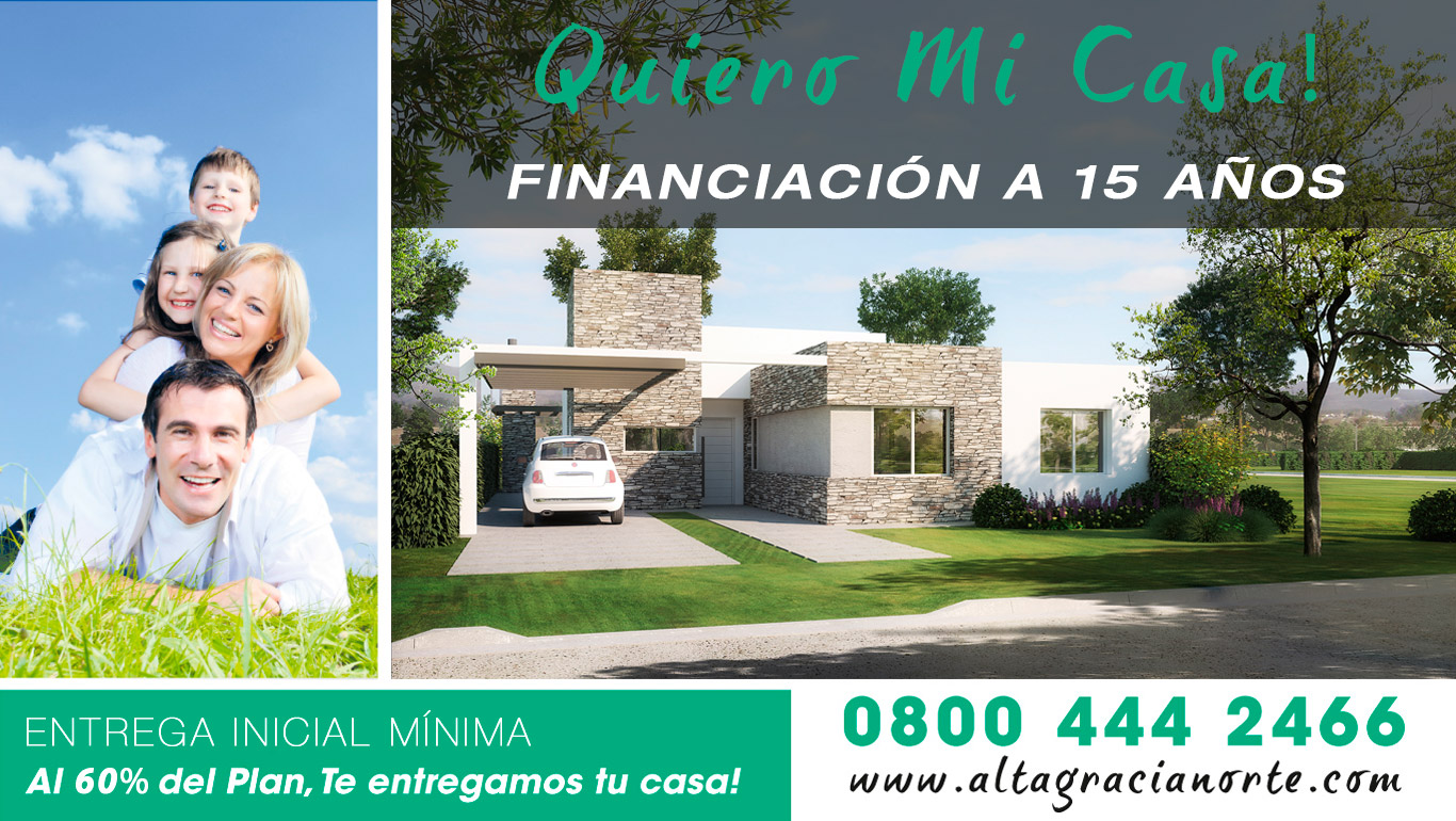 Alta Gracia Norte te ofrece 8 Tipologías diferentes de Casas para que elijas el diseño que mas te guste, de 2 o 3 dormitorios. Casa construida en una planta y cuenta con dos dormitorios . De 2 dormitorios. Casa construida en una planta y cuenta con tres dormitorios . De 3 dormitorios. Casa construida en una planta y cuenta con dos o tres dormitorios . De 2 o 3 dormitorios. Casa construida en una planta y cuenta con dos dormitorios . De 2 dormitorios. Casa construida en una planta y cuenta con tres dormitorios . De 3 dormitorios. Casa construida en una planta y cuenta con dos o tres dormitorios . De 2 o 3 dormitorios. Casa construida en una planta y cuenta con dos dormitorios . De 2 dormitorios. Casa construida en una planta y cuenta con tres dormitorios . De 3 dormitorios. Casa construida en una planta y cuenta con dos o tres dormitorios . De 2 o 3 dormitorios. Casa construida en una planta y cuenta con dos dormitorios . De 2 dormitorios. Casa construida en una planta y cuenta con tres dormitorios . De 3 dormitorios. Casa construida en una planta y cuenta con dos o tres dormitorios . De 2 o 3 dormitorios. Nueva Urbanización en Alta Gracia Alta Gracia Norte posee un Plan de Financiación adaptado a las posibilidades de inversión de la clase media, con financiación de hasta 180 cuotas. Estos planes permiten a los inversores solucionar el tema de la vivienda y lote en un solo momento, olvidándose de comprar primero un lote para luego tener que pensar en cómo hacer la casa.PLAN QUIERO MI CASA